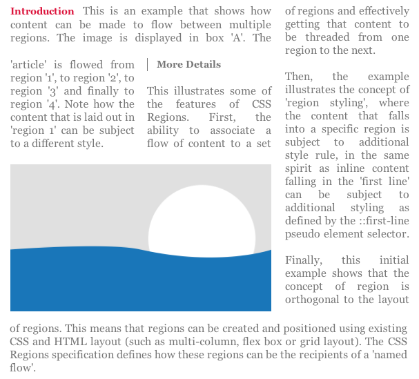 The following example illustrates how an <article> element is placed in a named flow and how boxes marked with “region1”, “region2”, “region3” and “region4” IDs become CSS Regions that consume the “article-flow” content.