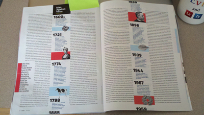Here there are two named flows, but the contents are related. The flow running through the gutter of the main article is a timeline of events the article refers to. This can be accomplished in either continuous or paginated contexts with sets of three regions. Here’s a paginated solution using Page Templates (assuming content to refer to and a box to paginate in). There is also a full mockup that works in the WebKit nightly build or Chrome 19 with the regions features turned on.